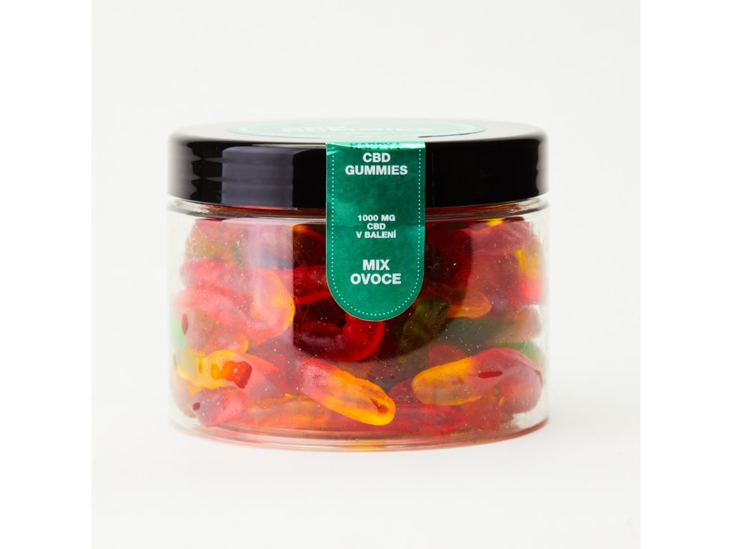 SLOŽENÍ: Kukuřičný sirup (z kukuřice), cukr (z řepy), voda, želatina, kyselina: kyselina mléčná, kyselina citronová, přírodní a umělá aromata, kyselina fumarová, pektin (získaný z ovoce), kokosový olej, barviva, CBD (kanabidiol) z konopí.